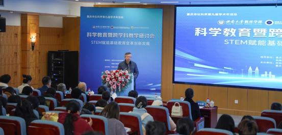12月27日,重庆市社科界第九届学术年系列活动之“科学教育暨跨学科教学研讨会”在西南大学教育学部802报告厅举行,会议由西南大学STEAM跨学科国际教育研究中心(简称STEAM中心)与重庆市青少年家校社共育研究会联合主办,重庆市社科联及教育学部指导。研讨会以“STEM赋能基础教育变革创新发展”为主题,旨在推动科学教育与跨学科教学融合,来自校内外的近100名专家、学者、留学生和研究生参加会议。