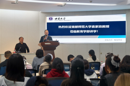 2025年10月26日,应成渝双城经济圈高校智能化教学改革虚拟教研室邀请,首都师范大学二级教授、博士生导师袁家政教授应邀莅临西南大学教育学部,作题为《新型人工智能发展与教育多元场景应用》的学术报告。教育技术学院常务副院长余亮教授主持,两百余名师生到场参与。