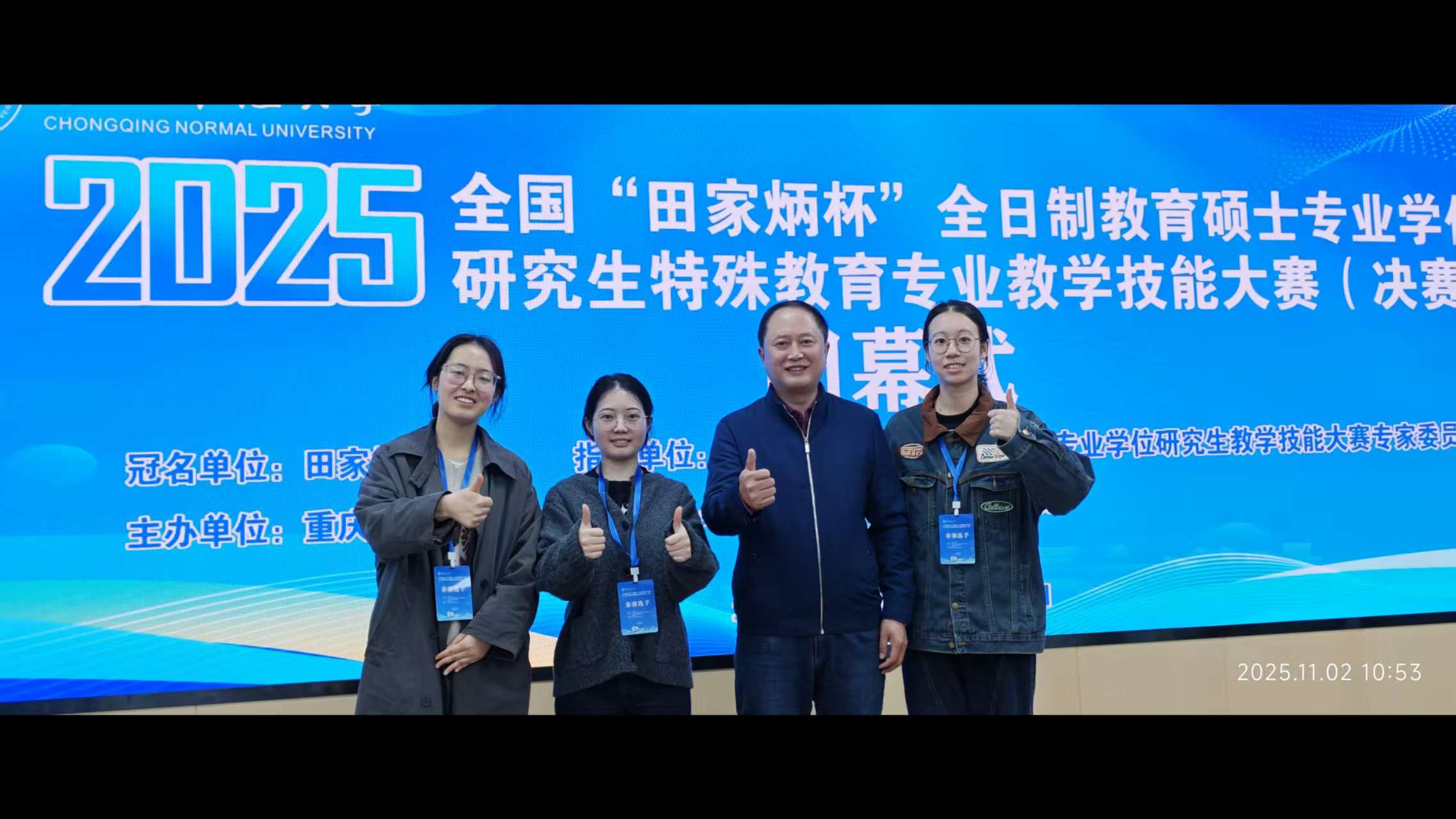 2025年10月31日至11月2日,全国“田家炳杯”全日制教育硕士专业学位研究生特殊教育专业教学技能大赛决赛在重庆师范大学大学城校区成功举办。本届决赛汇聚全国26所师范院校的优秀研究生学子,以“培育卓越特教教师,助力特殊教育高质量发展”为目的,通过模拟授课与现场答辩相结合的形式,检验参赛选手的教学设计能力、课堂实践能力及应变能力。参赛选手通过抽签确定分组及出场顺序,依次完成90分钟备课、10分钟模拟授课及5分钟现场答辩。大赛组委会在决赛期间还同步开展了特殊教育专业硕士人才培养论坛。西南大学参赛领队、特教学院院长赵斌教授主持论坛,并就《特殊教育研究生跨学科培养模式的重构》做了交流报告。