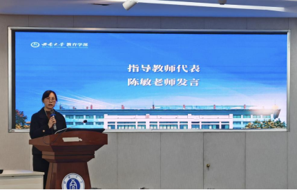 动员大会上,教育技术学院陈敏作为实习指导教师代表发言,鼓励同学们要在实习过程中注重循序渐进和主动沟通,表示指导教师团队将从多个方面提供实习指导和支持。