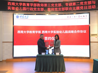 活动还举行了政治生日仪式、图书捐赠仪式和《西南大学教育学部西南大学实验幼儿园战略合作协议书》签约仪式。教师第三党支部书记江小英老师为党员赠送生日贺卡,传递党组织的关怀与期许,并代表教育学部两个支部向实验幼儿园捐赠优质绘本,助力实验幼儿园教育教学提升。周文全书记介绍了双方战略合作内容,双方秉持“资源共享、优势互补”原则,签约达成教师培育、课程共享、家校指导等五大方面长期合作。