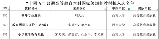 近日,教育部公布“十四五”普通高等教育本科国家级规划教材拟入选名单,西南大学教育学部朱德全教授主编的《教育测量与评价》、宋乃庆教授主编的《小学数学教育概论》、刘义兵教授主编的《教师专业发展》三部教材成功入选,充分彰显了学部在教材建设领域的深厚积淀与过硬实力。