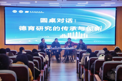 12月12日晚,论坛举行“德育研究的传承与创新”圆桌对话。全国德育学术委员会荣誉理事长檀传宝教授、副理事长杜时忠教授、原副理事长黄向阳教授、易连云教授,常务理事林丹教授、理事叶飞教授等两代德育学人对话德育研究的传承与创新。